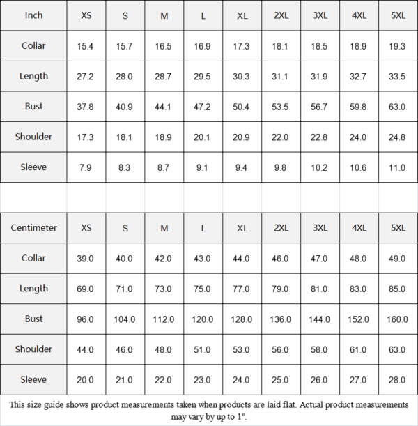 inch XS S M L XL 2XL 3XL 4XL 5XL