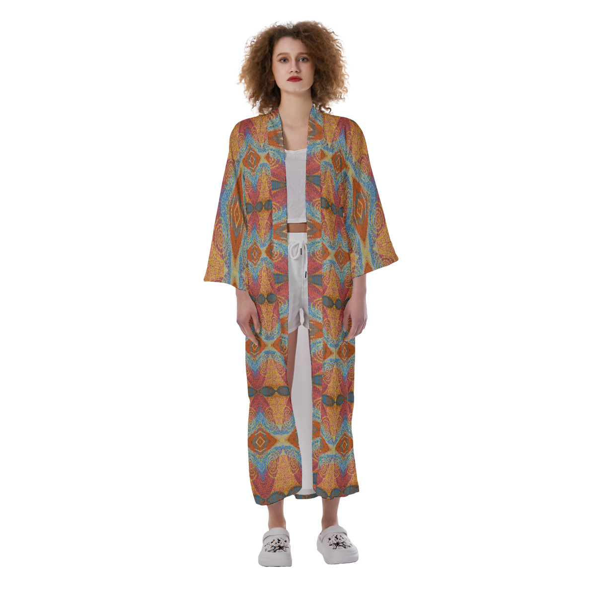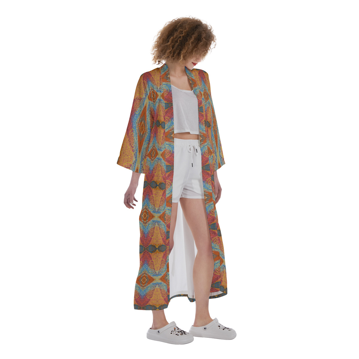 • Removable waist tie closure, long robe, side slit.